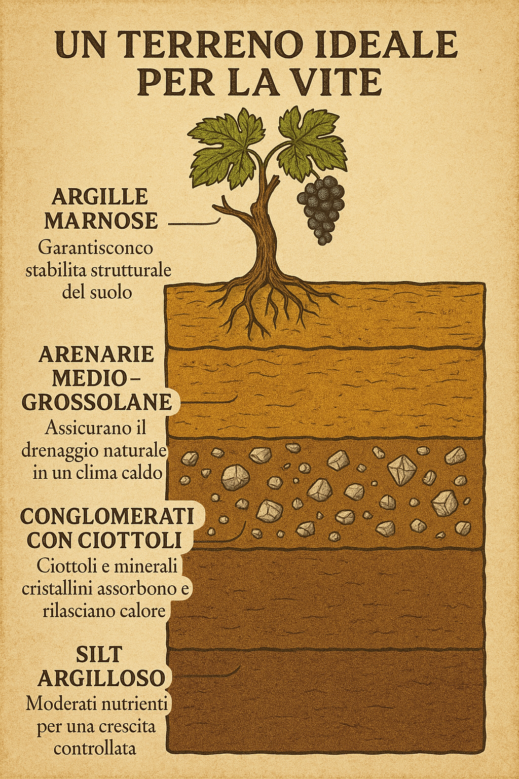 Ma il vero tesoro dei nostri suoli è la presenza di conglomerati con ciottoli e minerali cristallini, che durante il giorno assorbono il calore del sole e lo rilasciano lentamente durante la notte. Questo aiuta la maturazione delle uve e arricchisce il vino con profili aromatici più complessi.